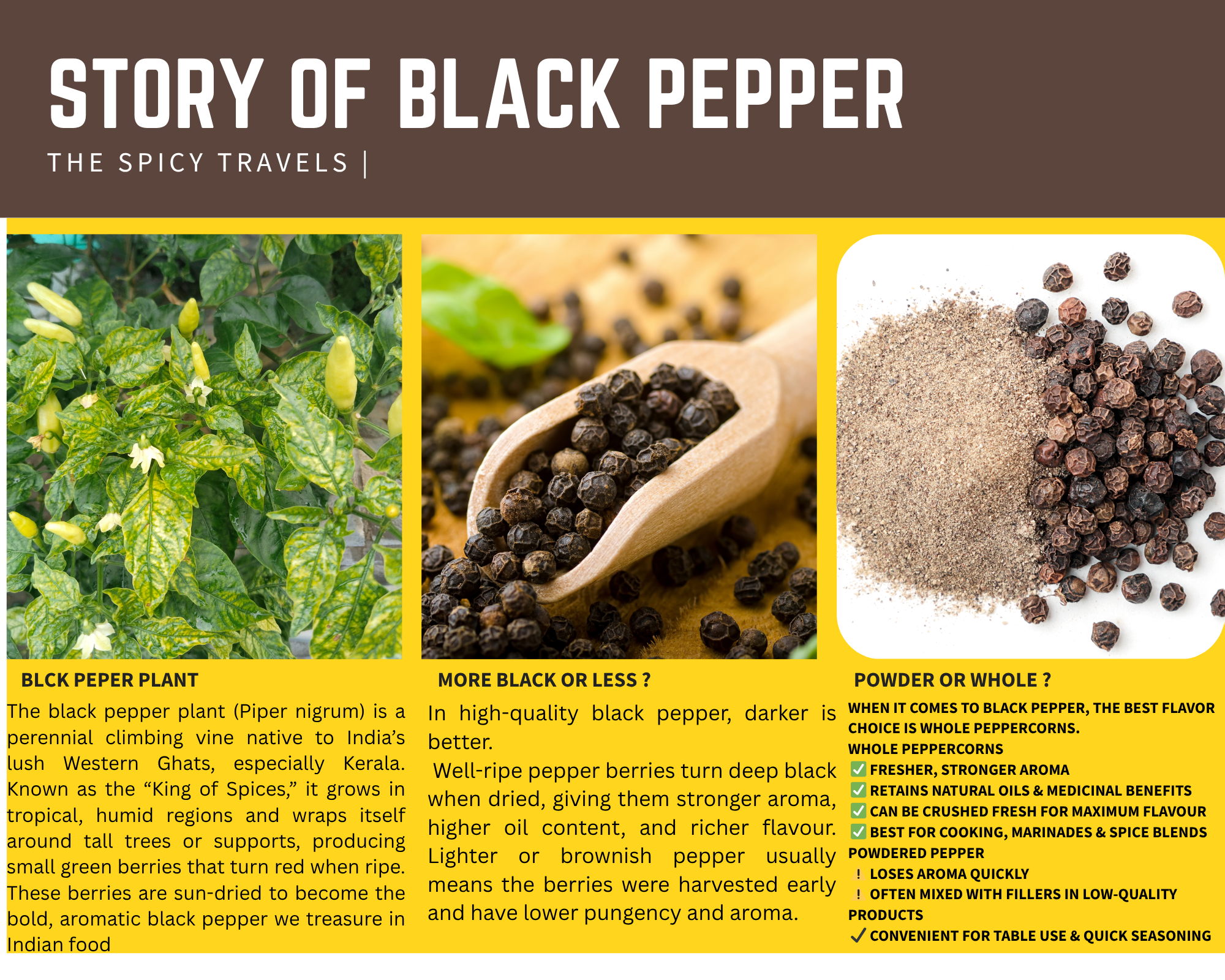 Black cardamom comes from the plant Amomum subulatum, native to the Eastern Himalayas, including regions of India, Nepal, and Bhutan. The spice is harvested from large seed pods, which are dark brown to black in color and contain small seeds. Unlike green cardamom, black cardamom has a distinctly smoky and earthy flavor due to the drying process over open flames, which enhances its aroma. In India, black cardamom is known as Badi Elaichi and is considered stronger and more pungent than green cardamom.